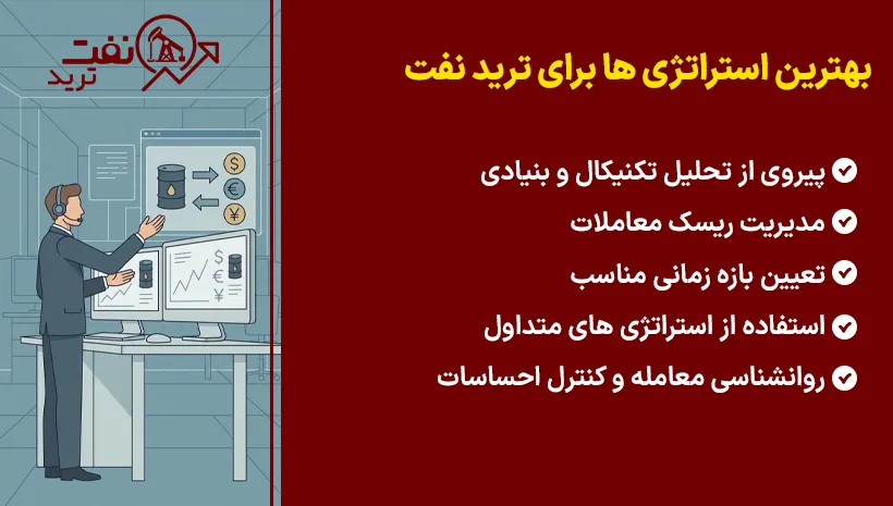 موفقیت در این بازار، نیازمند استراتژی های مشخص و رعایت نکات کلیدی است که می تواند ریسک ها را کنترل کرده و شانس موفقیت را افزایش دهد. در این مقاله بهترین استراتژی ها برای ترید نفت را بیان میکنیم: